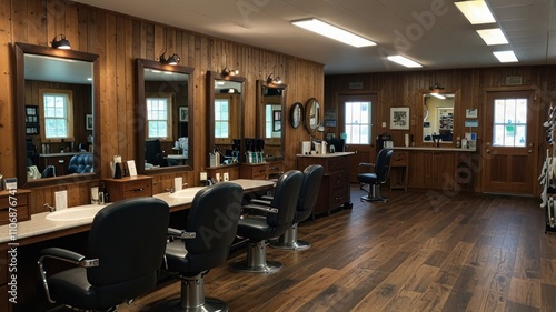 Rustic barbershop interior with wooden walls, barber chairs, and mirrors.