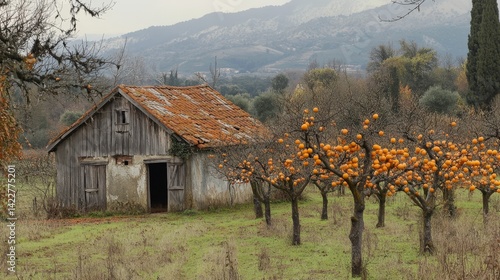 Rustic Barn by Orange Trees in a Citrus Farm