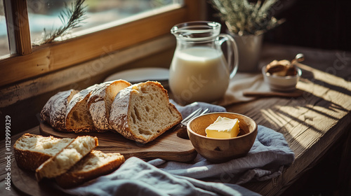 Rustic Breakfast Sliced Bread Milk Butter Wooden Table