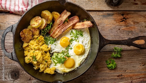 Rustic cast iron pan holding delicious country breakfast of eggs, potatoes, and bacon