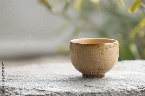 Rustic ceramic tea cup on a textured stone surface with blurred green background, emphasizing simplicity and natural elegance in design