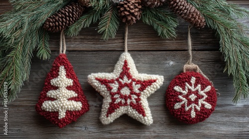 Rustic christmas decorations with red and white knitted ornaments on wooden background