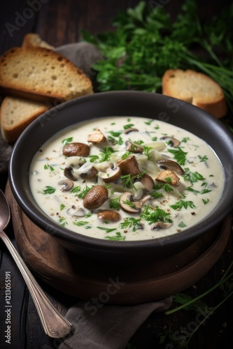 Rustic Cream of Mushroom Soup in a Savory Fall Setting with Croutons and Herbs on a Tray