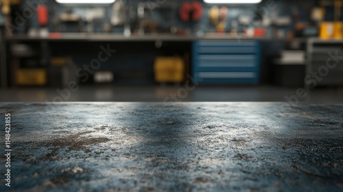 Rustic dark blue metallic surface; blurred workshop background. Perfect for product display, showcasing tools, or adding an industrial feel to designs.