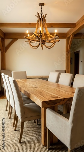 Rustic dining room with antler chandelier, wooden table and upholstered chairs in modern farmhouse interior design for home decor inspiration.