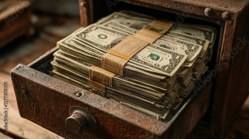 Rustic drawer filled with bundles of us dollar bills in a vintage setting