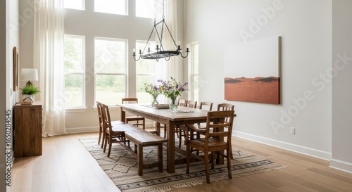 Rustic Farmhouse Dining Room with Abundant Natural Light and Abstract Art