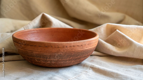 Rustic handmade pottery bowl on linen cloth, perfect for food photography and warm home decor