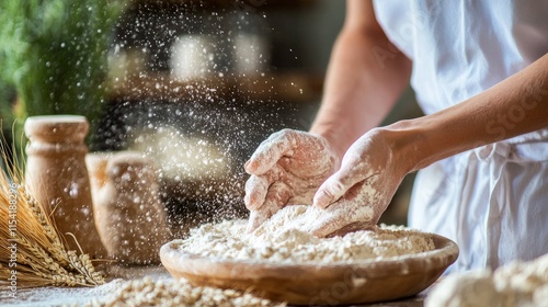 Rustic hands kneading dough with flour