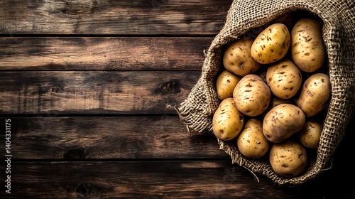 Rustic Harvest: A Burlap Sack Overflowing with Fresh Potatoes on a Weathered Wooden Surface