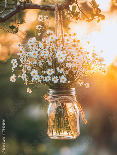 Rustic jar of daisies hanging on a branch with warm sunlight