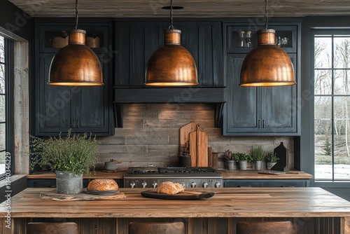 Rustic kitchen island with copper pendants, modern farmhouse style