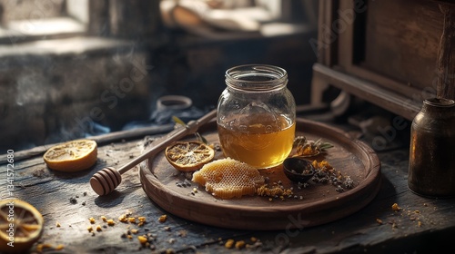 Rustic kitchen scene with honey jar, dried oranges, and honeycomb on wooden table.