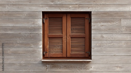 rustic mahogany window with timber cladding, hinged shutter, sound insulation in high definition.