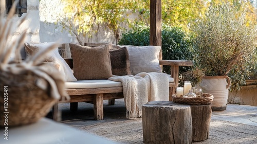Rustic outdoor space with wooden furniture and cozy blankets