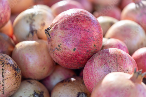 Rustic pomegranates with speckled skins gathered at a farmers’ market; selective focus and bright light highlight fresh produce richness and an organic fruits lifestyle.