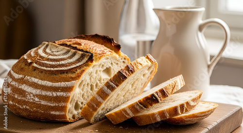 Rustic sourdough bread loaf sliced on a wooden board with milk pitcher backdrop