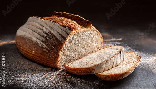 Rustic Sourdough Bread Loaf Sliced Revealing Airy Light Brown Crumb With Deep Golden Brown Crust And Scattered Flour Dusting On Dark Surface