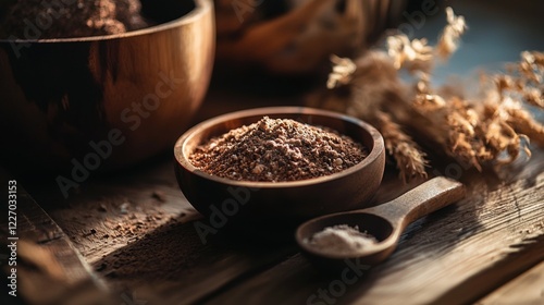 Rustic spices and ingredients on a wooden table in soft light