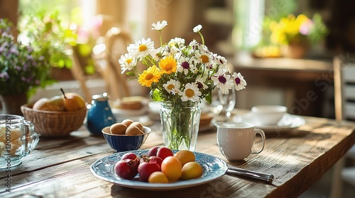 Rustic Spring Table Setting with Fresh Fruit and Flowers