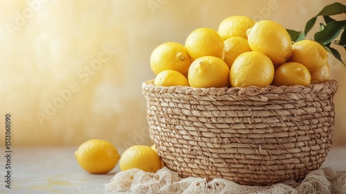 Rustic Still Life: A Woven Basket Overflowing with Fresh Lemons, Radiating Sunny Yellow Citrus Vibrance and Natural Charm