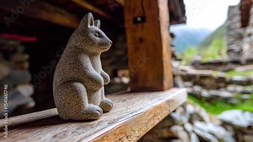 Rustic stone animal figurine on wooden shelf, mountain village backdrop
