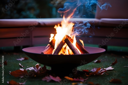 Rustic Stone Fire Pit with Burning Logs and Scattered Autumn Leaves in a Forest Setting