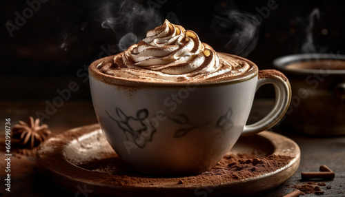 Rustic table holds frothy drinks, hot chocolate, and sweet desserts generated by AI