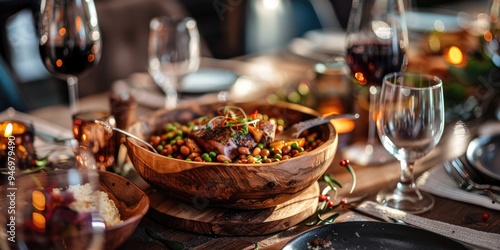 Rustic table setting with wooden bowl and spoon served with smoked pork leg and bean stew
