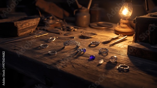 Rustic table with wire-wrapped rings, silver tools, and gemstones under soft lighting