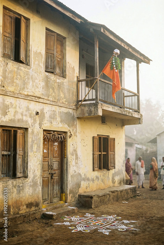 Rustic village home adorned with Gudi on balcony and rangoli at doorstep, celebrating Gudi Padwa and welcoming Marathi New Year with tradition and devotion.