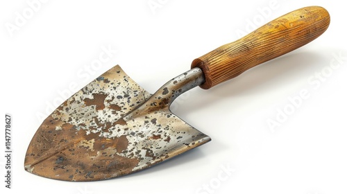 Rustic vintage gardening shovel with a worn weathered metal blade and a wooden handle abandoned and neglected representing manual labor earthwork and industrial heritage