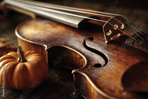Rustic Violin and Miniature Pumpkin in Warm, Moody Autumnal Light.