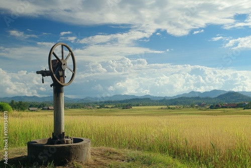 Rustic Water Pump in Rice Field Surrounded by Lush Greenery and Dramatic Clouds Under Bright Blue Sky in Rural Landscape Setting