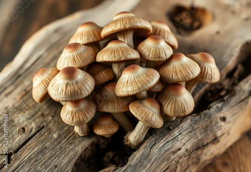 Rustic wooden background with a cluster of freshly foraged wild mushrooms