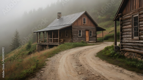 Rustic Wooden Cabin on Foggy Countryside Path