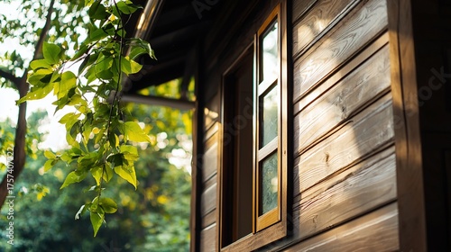Rustic Wooden Cabin Window Framed by Lush Greenery in Soft Sunlight.