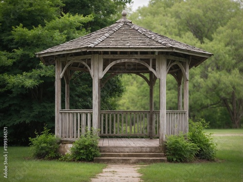 Rustic wooden gazebo surrounded by lush green trees in a peaceful park setting