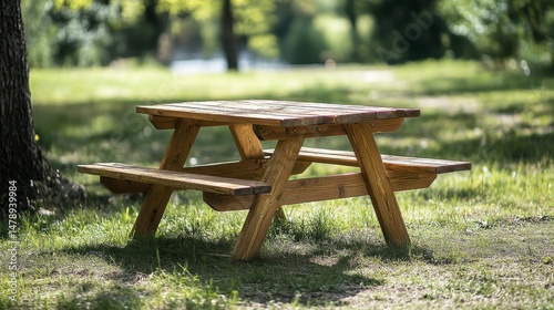 Rustic wooden picnic table in a sunny park.