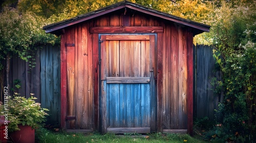 Rustic Wooden Shed with Blue Door Autumn Scenery
