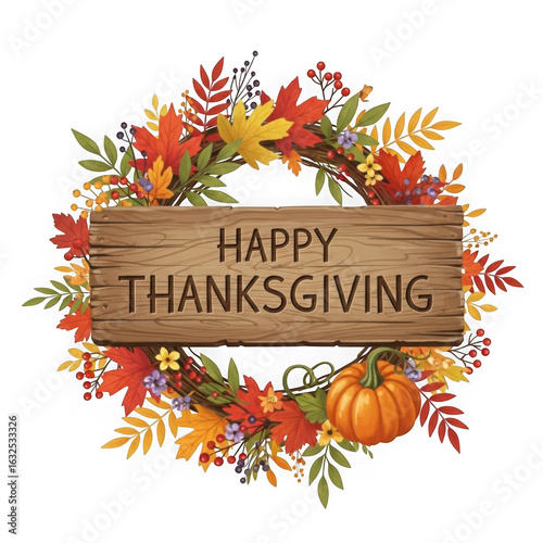 Rustic wooden sign with autumn leaves and pumpkin happy thanksgiving isolated on transparent background