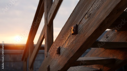 Rustic wooden staircase railing illuminated by warm sunset light showcasing weathered texture and simple construction details