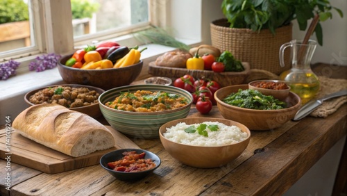 Rustic Wooden Table Featuring Assorted Global Dishes and Ingredients