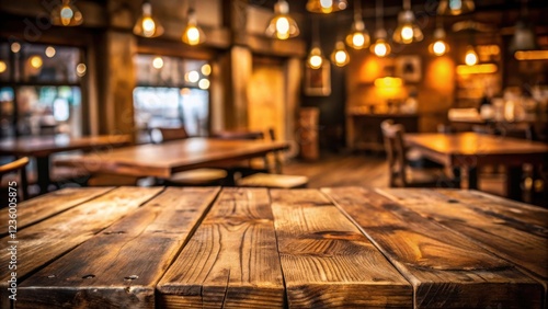 Rustic wooden table in a dimly lit cafe with warm yellow lights and a blurred background