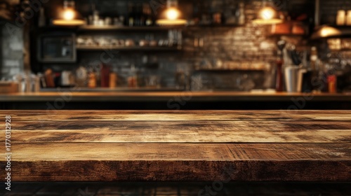Rustic Wooden Table in Cozy Bar Atmosphere with Soft Lighting