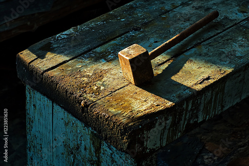 Rustic wooden table with a weathered mallet casting shadows in a dimly lit workshop setting