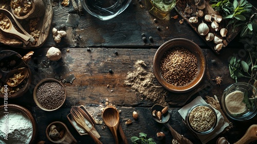 Rustic wooden table with spice bowls and herbs