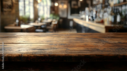 Rustic Wooden Tabletop in a Warmly Lit Bar Setting, Ideal for Product Placement or Mockups
