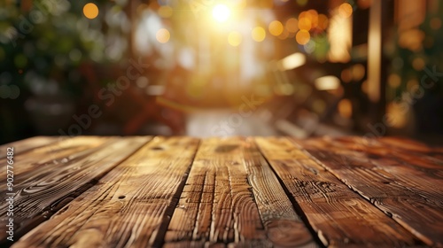 Rustic Wooden Tabletop with Blurred Background and Warm Sunlight Outdoors