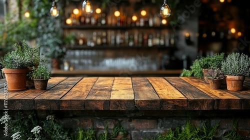 Rustic Wooden Tabletop with Plants and Bar Background